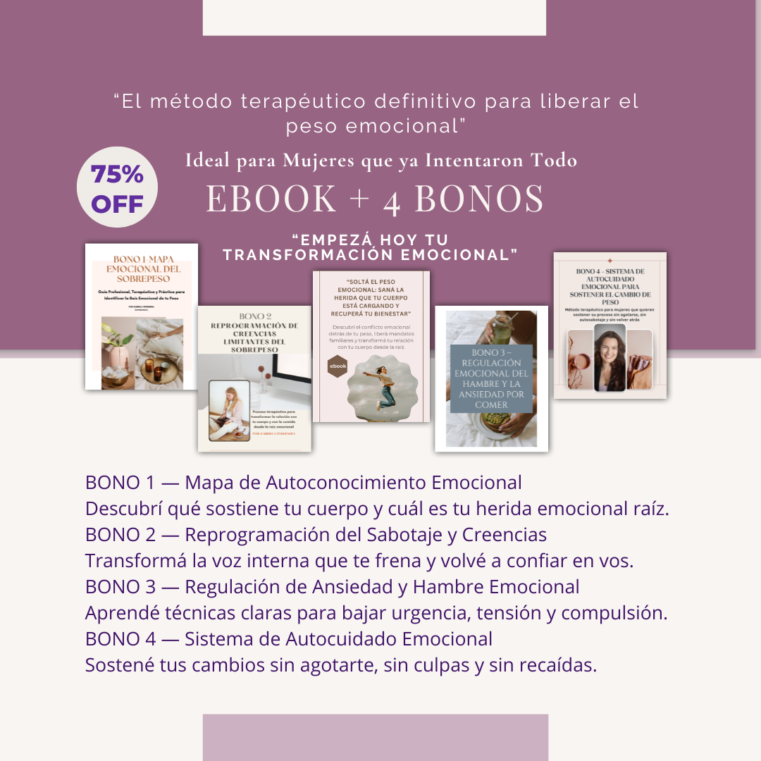 Este programa incluye un ebook profesional + 4 bonos exclusivos que te guían paso a paso a liberar heridas emocionales, transformar el hambre emocional, regular la ansiedad, desactivar el autosabotaje y sostener cambios reales sin agotarte.